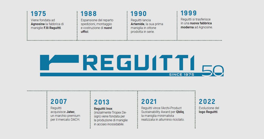 Im Jahr 2025 erreicht Reguitti einen wichtigen Meilenstein: 50 Jahre Exzellenz, Innovation und Design in der Herstellung von Griffen und Beschlägen für Türen und Fenster. Dieses halbe Jahrhundert erzählt die Geschichte eines italienischen Unternehmens, das sich dank der Leidenschaft und des Engagements der Brüder Reguitti von einem kleinen Handwerksbetrieb zu einem international bekannten Namen entwickelt hat. Was als Familienprojekt im Herzen der italienischen Fertigungstradition begann, hat sich zu einem Unternehmen entwickelt, das für seine Fähigkeit bekannt ist, Trends zu antizipieren, sich an Marktveränderungen anzupassen und Produkte von ausgezeichneter Qualität zu gewährleisten, während es seinen ursprünglichen Werten treu bleibt.