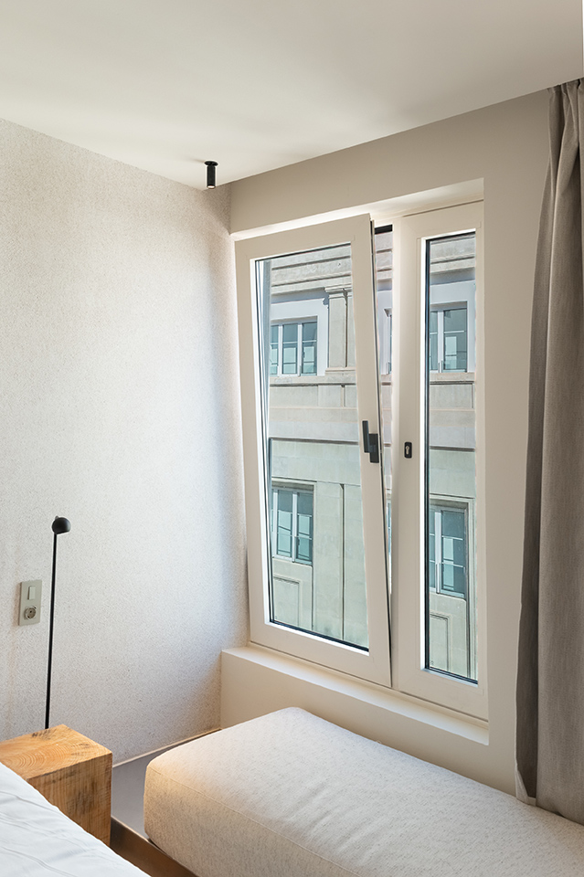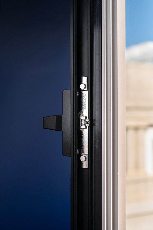 Per realizzare gli infissi, Alucansa ha scelto gli accessori Giesse. Grazie alle cerniere a scomparsa C.H.I.C. le finestre offrono integrazione estetica e alte prestazioni. Le cremonesi Kora completano il design con finiture dedicate che assicurano coerenza con il mood architettonico.