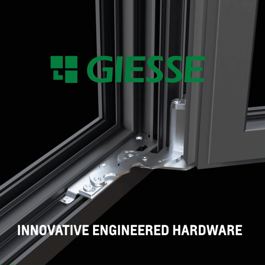 - La soluzione per facciate Giesse, composta dal meccanismo Ghibo Plus CW ad apertura esterna e dalla cremonese Euro CW disassata.